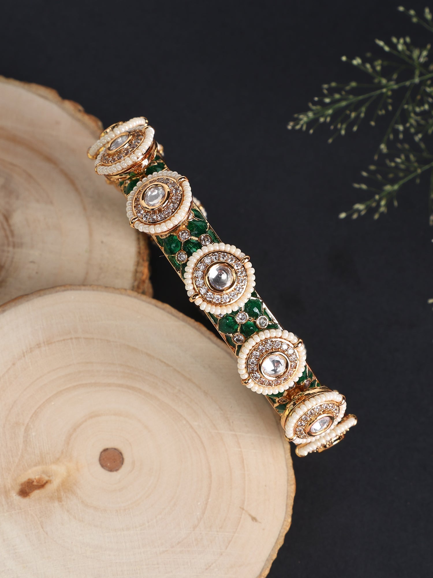 Indulge in the allure of our Jadau Kadas, meticulously crafted to captivate. Each piece showcases intricate patterns and vibrant gemstones, exuding timeless elegance. Perfect for adding a touch of sophistication to any ensemble, these bracelets are an essential accessory for those who appreciate refined luxury and impeccable craftsmanship.
