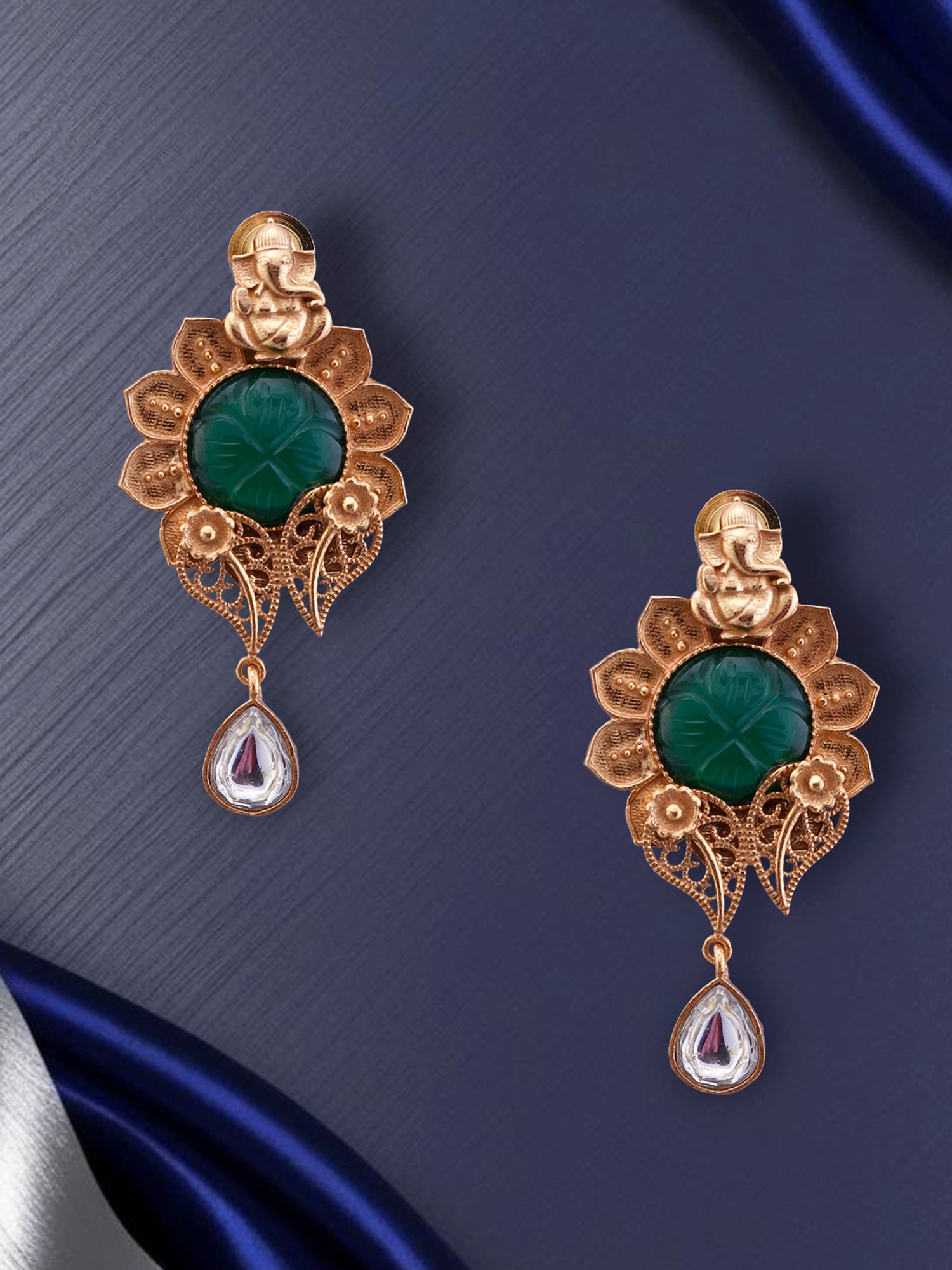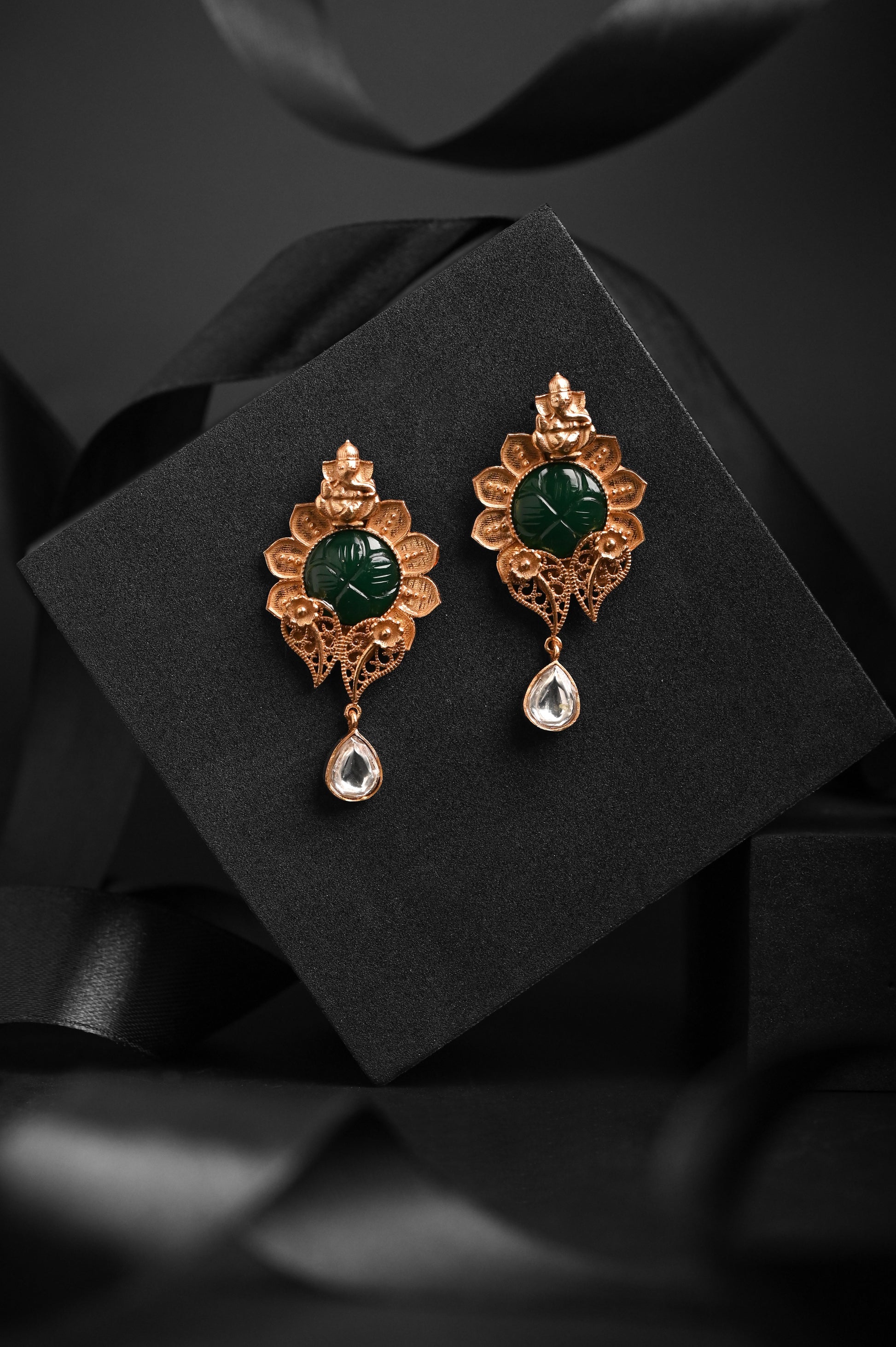 Impeccably crafted, our Jadau Earring collection epitomize perfection. Their intricate design boasts a luxurious gold tone, elevating any Indian or occasion wear ensemble. With an 18K Gold plating and a non-allergic polish, these earrings make a bold statement effortlessly, ensuring elegance and sophistication with every wear.