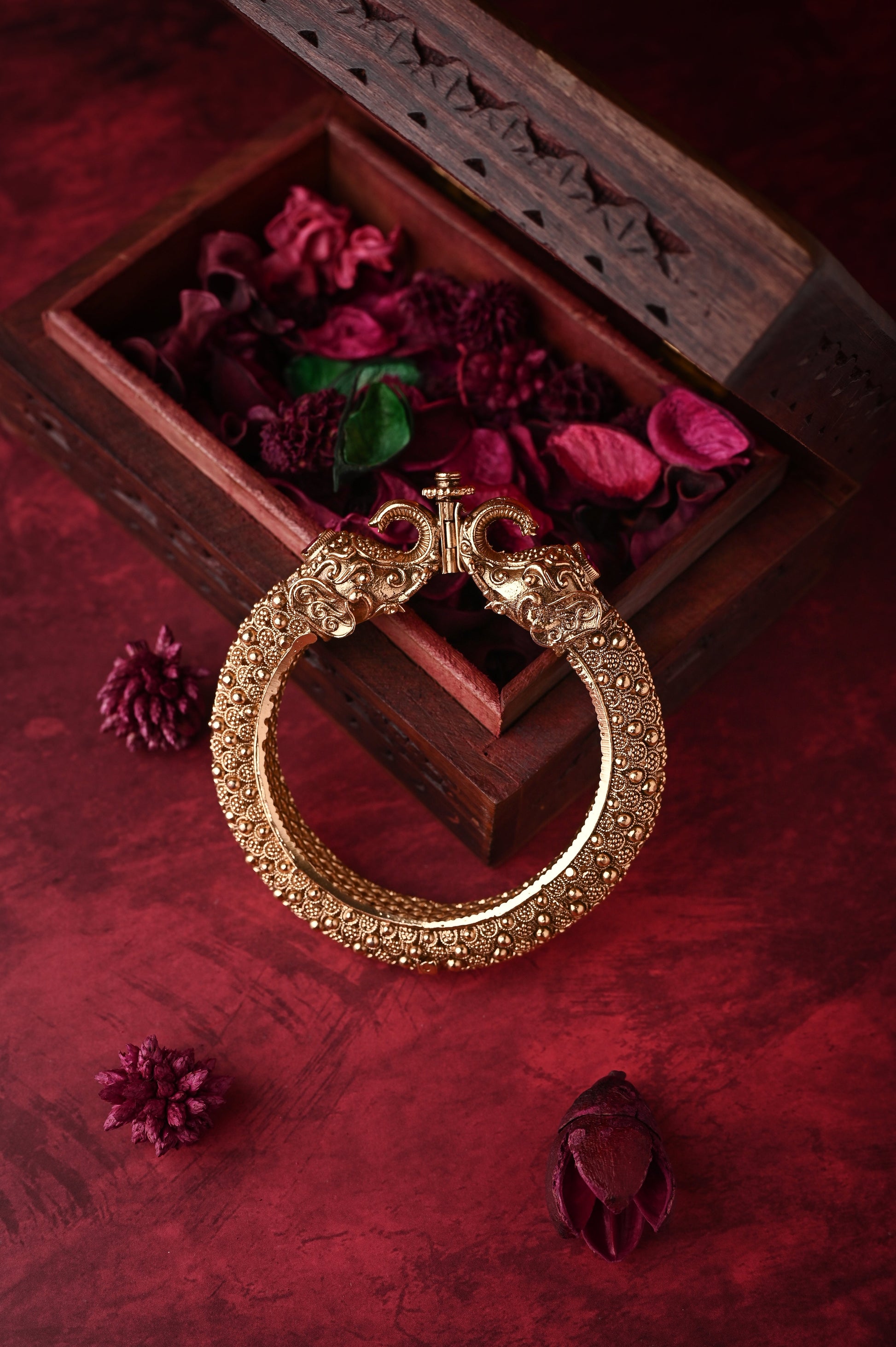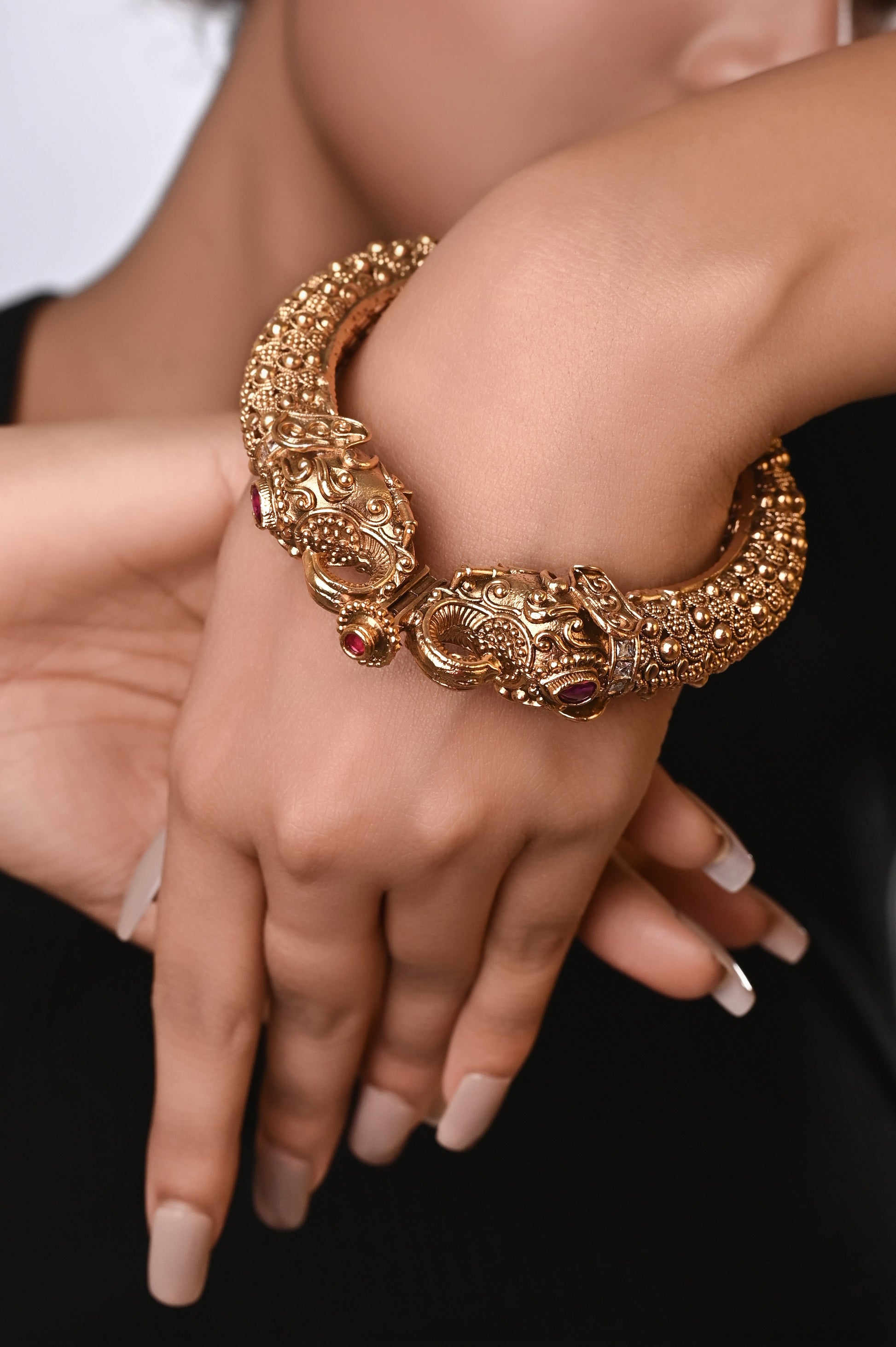 Indulge in the allure of our Jadau Bracelets, meticulously crafted to captivate. Each piece showcases intricate patterns and vibrant gemstones, exuding timeless elegance. Perfect for adding a touch of sophistication to any ensemble, these bracelets are an essential accessory for those who appreciate refined luxury and impeccable craftsmanship.