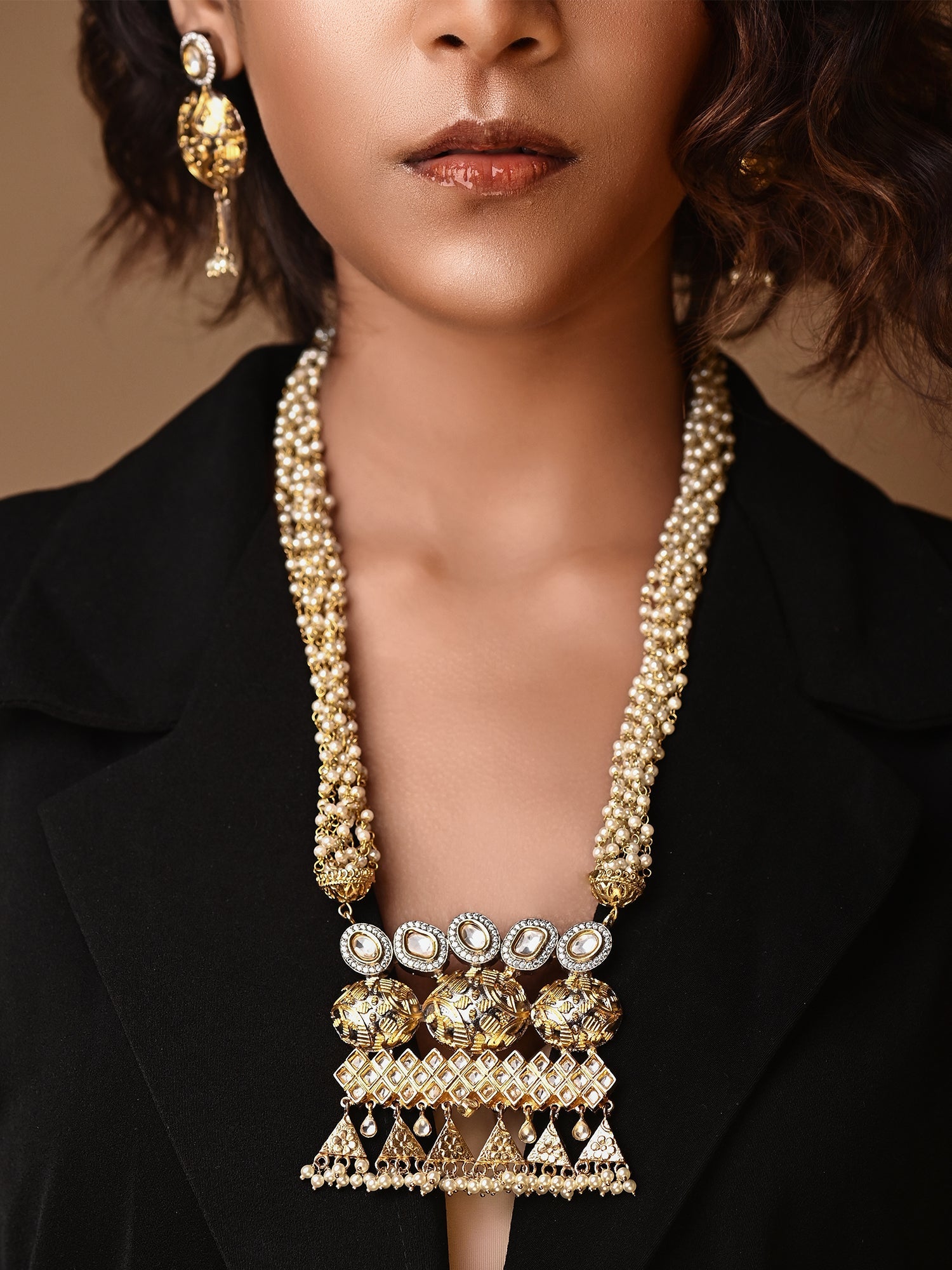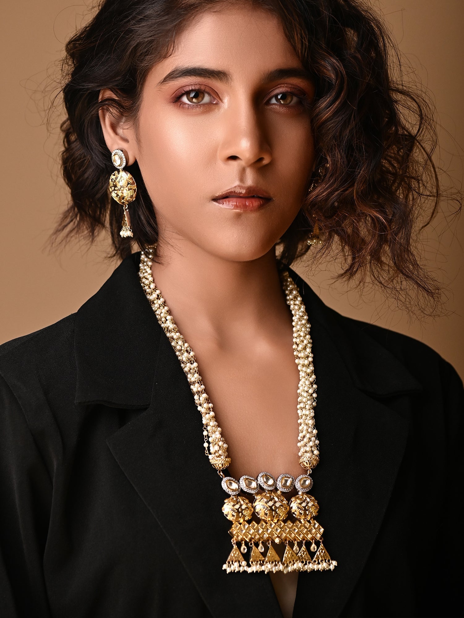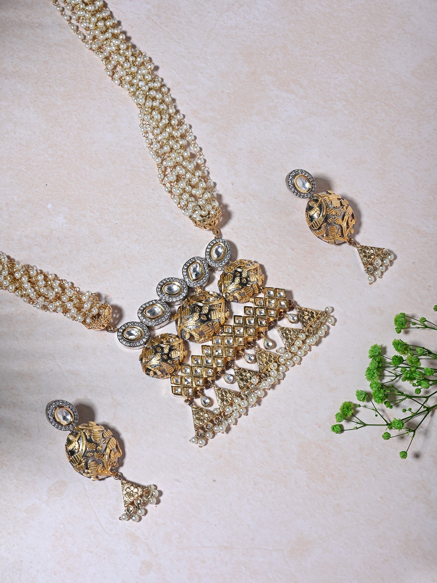 Elevate your elegance with our Jadau Necklace Sets, complete with matching earrings. Crafted with exquisite detail, these sets feature intricate designs and vibrant gemstones, adding a touch of luxury to any attire. Perfect for special occasions, they offer a timeless charm that effortlessly enhances your ensemble with sophistication and grace.
