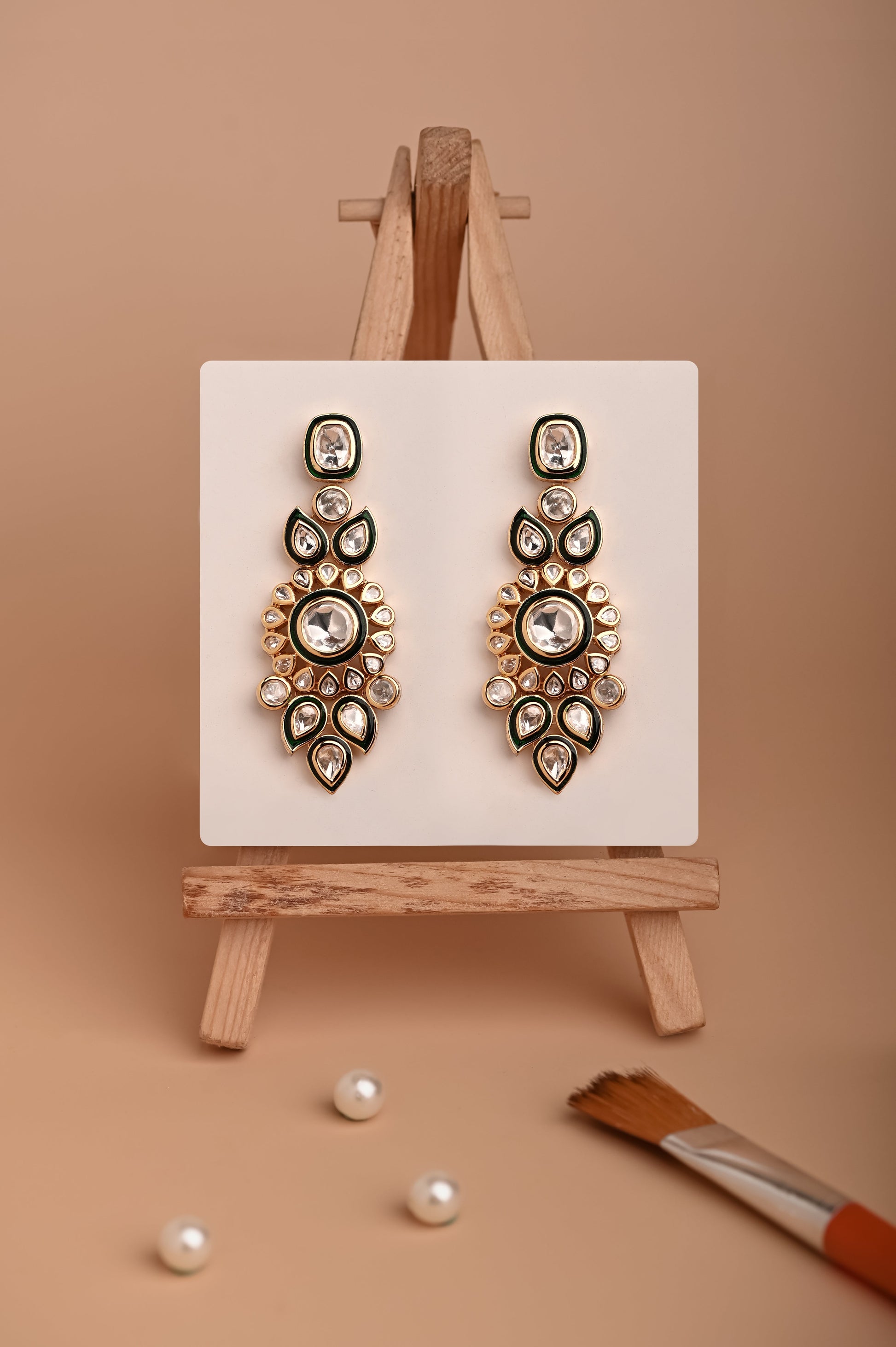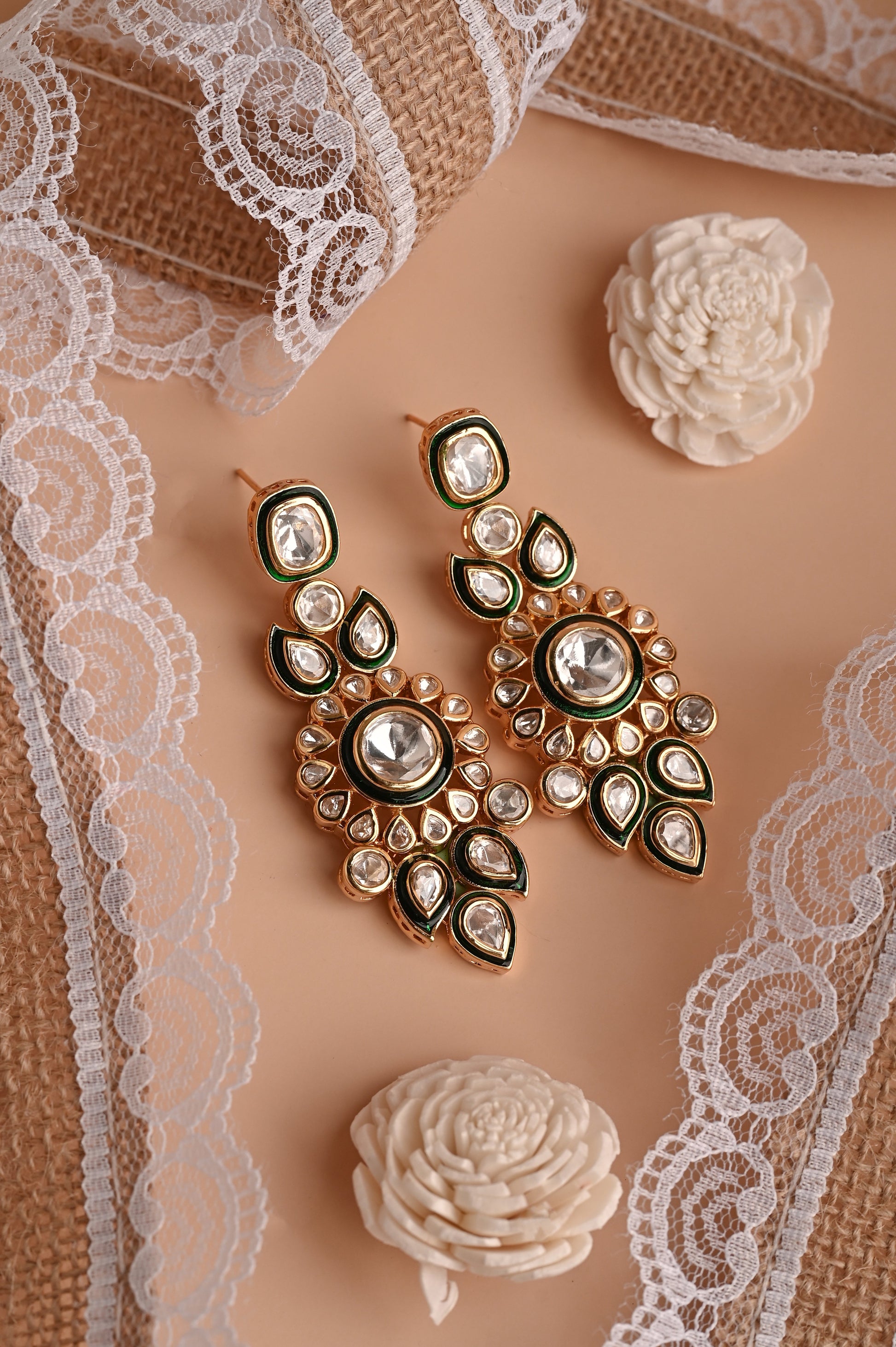 Impeccably crafted, our Jadau Earring collection epitomize perfection. Their intricate design boasts a luxurious gold tone, elevating any Indian or occasion wear ensemble. With an 18K Gold plating and a non-allergic polish, these earrings make a bold statement effortlessly, ensuring elegance and sophistication with every wear.