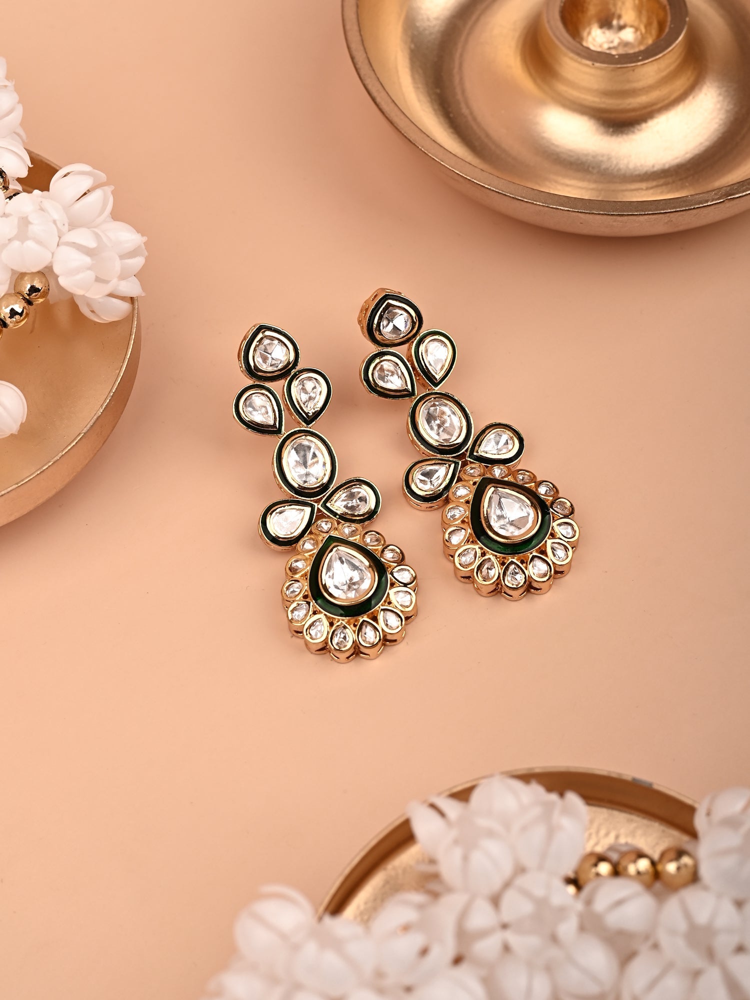 Impeccably crafted, our Jadau Earring collection epitomize perfection. Their intricate design boasts a luxurious gold tone, elevating any Indian or occasion wear ensemble. With an 18K Gold plating and a non-allergic polish, these earrings make a bold statement effortlessly, ensuring elegance and sophistication with every wear.